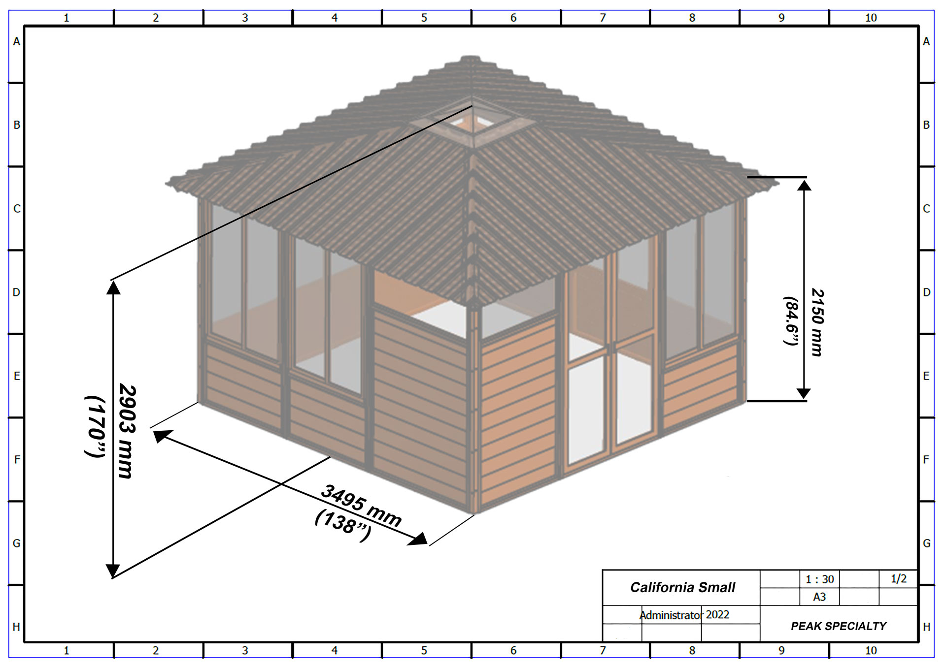 The interior wall to wall dimensions are 3375 mm x 4255 mm (133″ x 158″). The exterior wall to wall dimensions are 3495 mm x 4267 mm (138″ x 168″). The roof dimensions are 3902.5 mm x 4790.5 mm (154″ x 187″). Please note all imperial measurements are approximate.