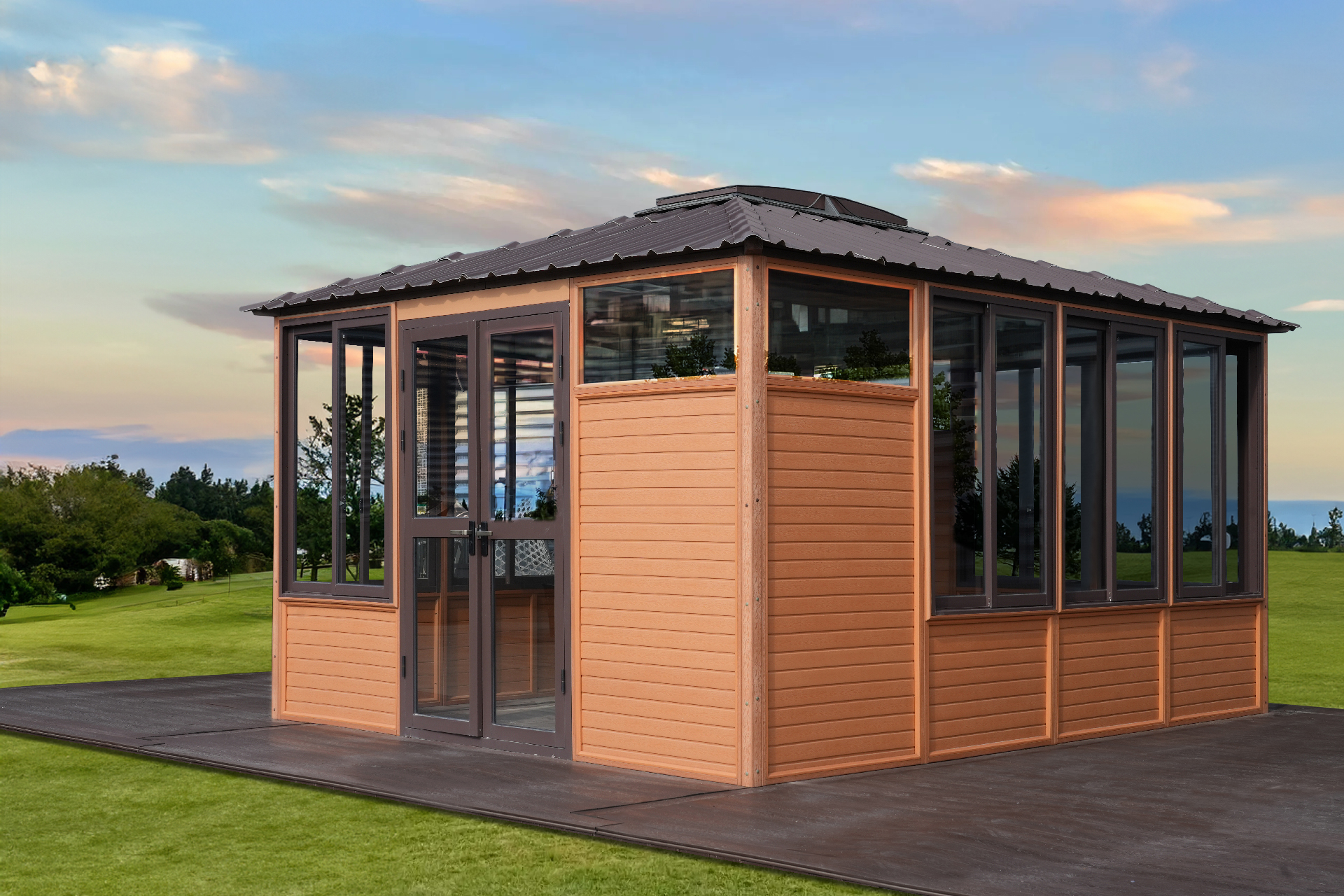 The California (11′ x 14′ approximately) is our newest multi-functional outdoor building with oversized windows to let in a lot of light and to provide excellent views. The California can be used as a backyard studio, tea house, spa gazebo, or for any other recreational purpose imaginable. The California is made of Durawood which looks and feels like wood but is made of a high-quality synthetic composite material that is maintenance free and environmentally friendly. The California has aluminum framed double French doors and sliding windows to ensure smooth opening and closing.