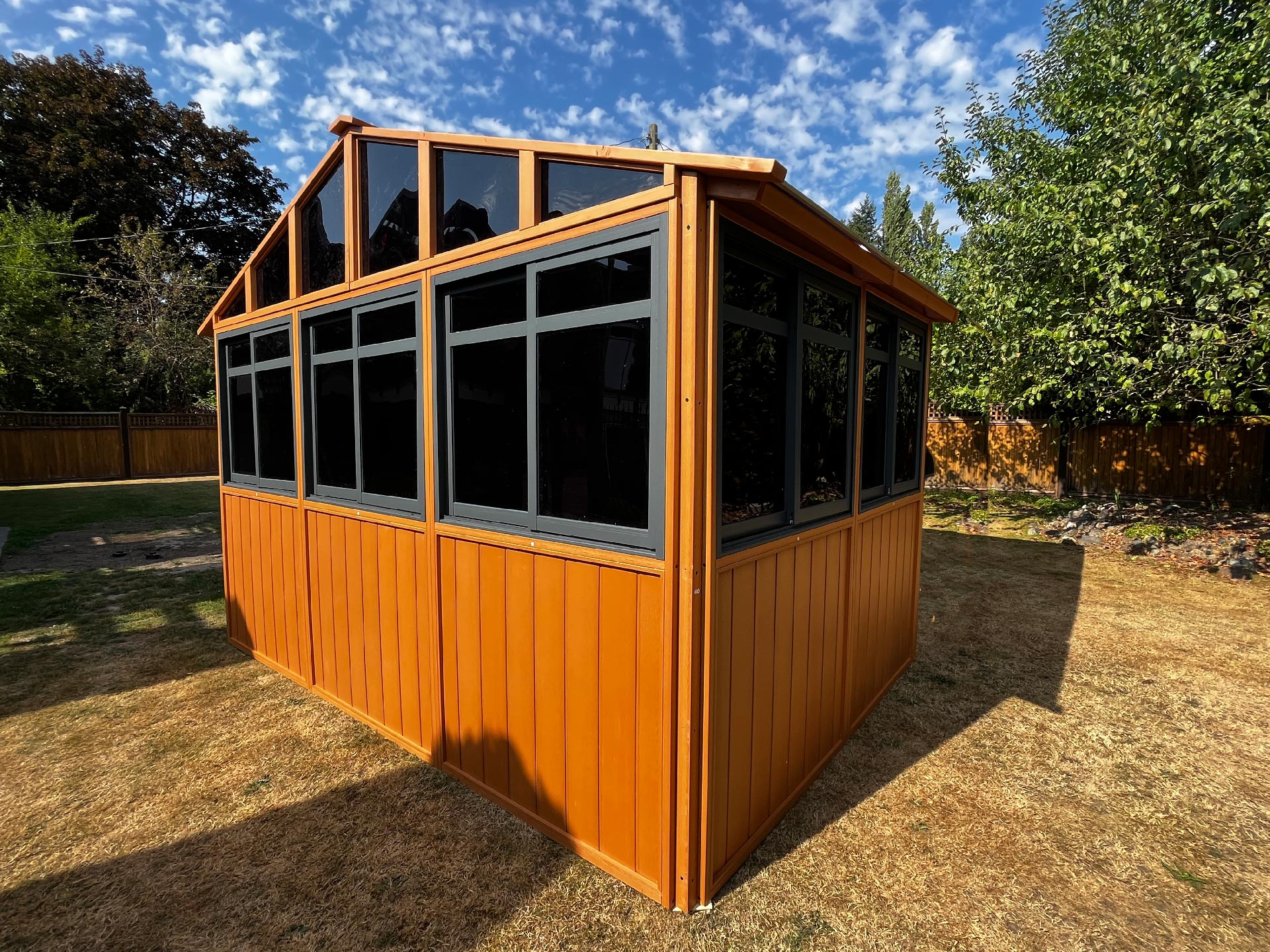 The Georgia (13′ x 8′ approximately) is a contemporary outdoor building with translucent Lexan roof panels that lets in a lot of natural light. Lexan is an excellent roofing material as it is super durable and virtually unbreakable. The Georgia can be used as a sunroom, spa gazebo, or backyard recreational studio. The wall panels are made of Durawood which looks like wood but is made of a high-quality synthetic material that is maintenance free and environmentally friendly. The Georgia has aluminum framed doors and windows to ensure smooth opening and closing. Also available in gray with gray roof and trim.