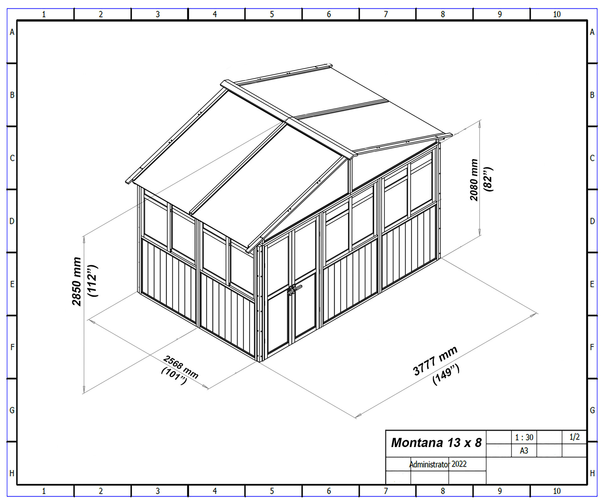 The interior wall to wall dimensions is 2418 mm x 3627 mm (95″ x 143″). The exterior wall to wall dimensions is 2568 mm x 3777 mm (101″ x 149″). The roof dimensions are 4224 mm x 2568 mm (166″ x 101″). Please note all imperial measurements are approximate.