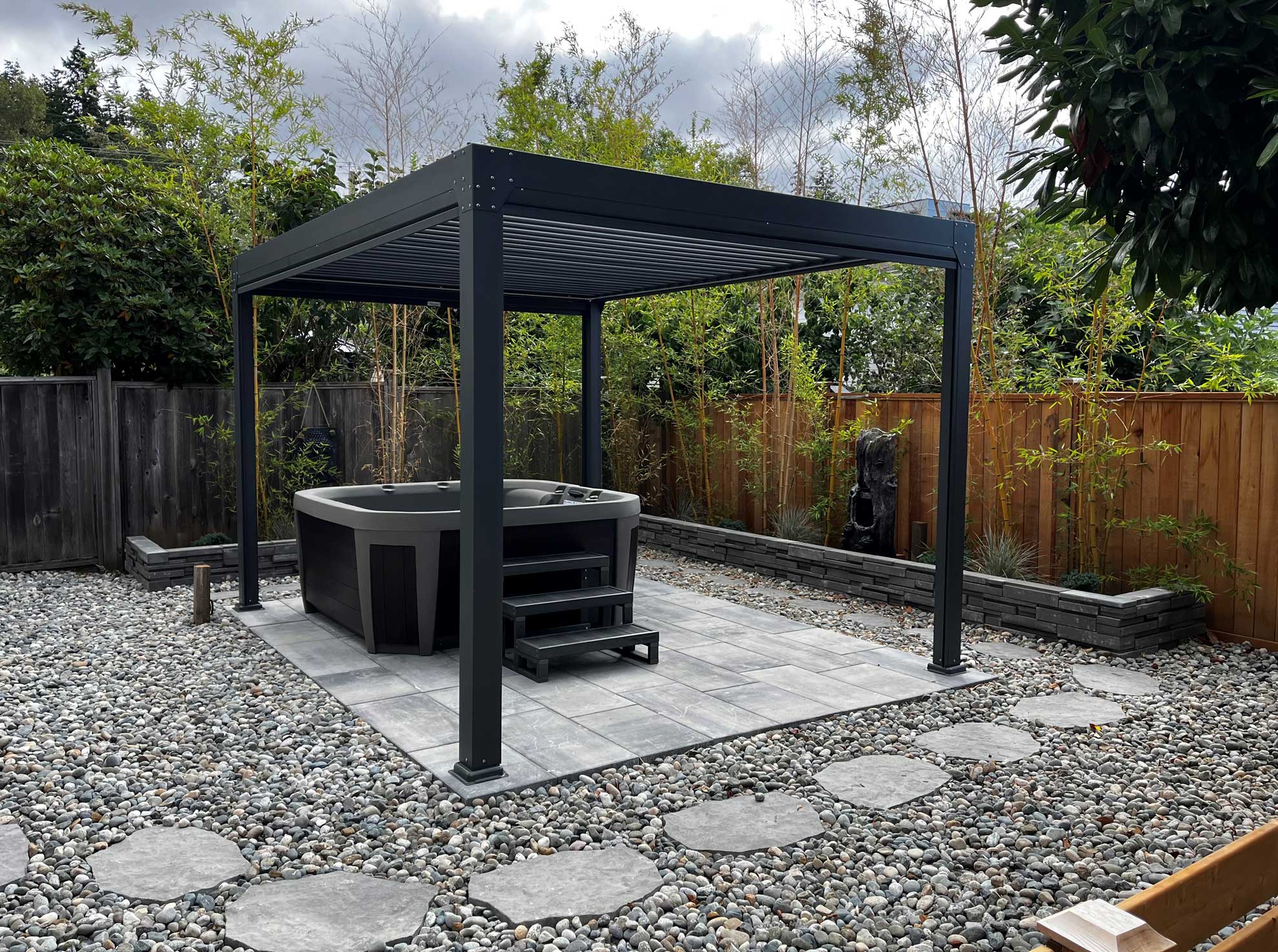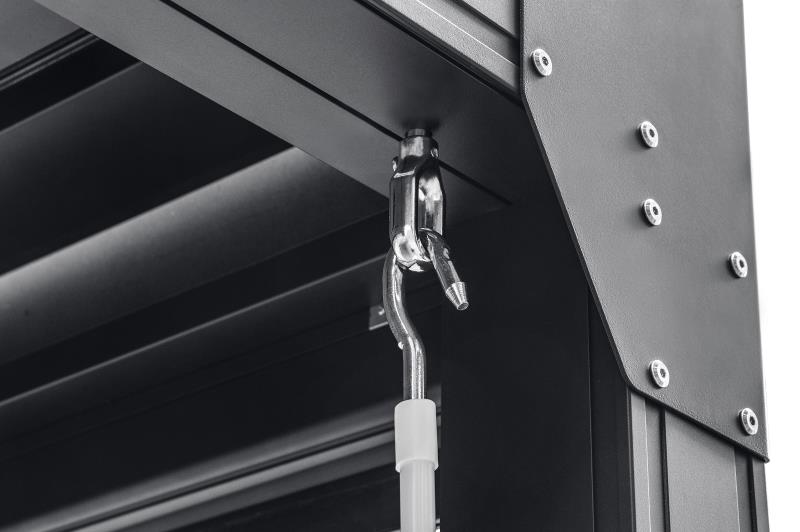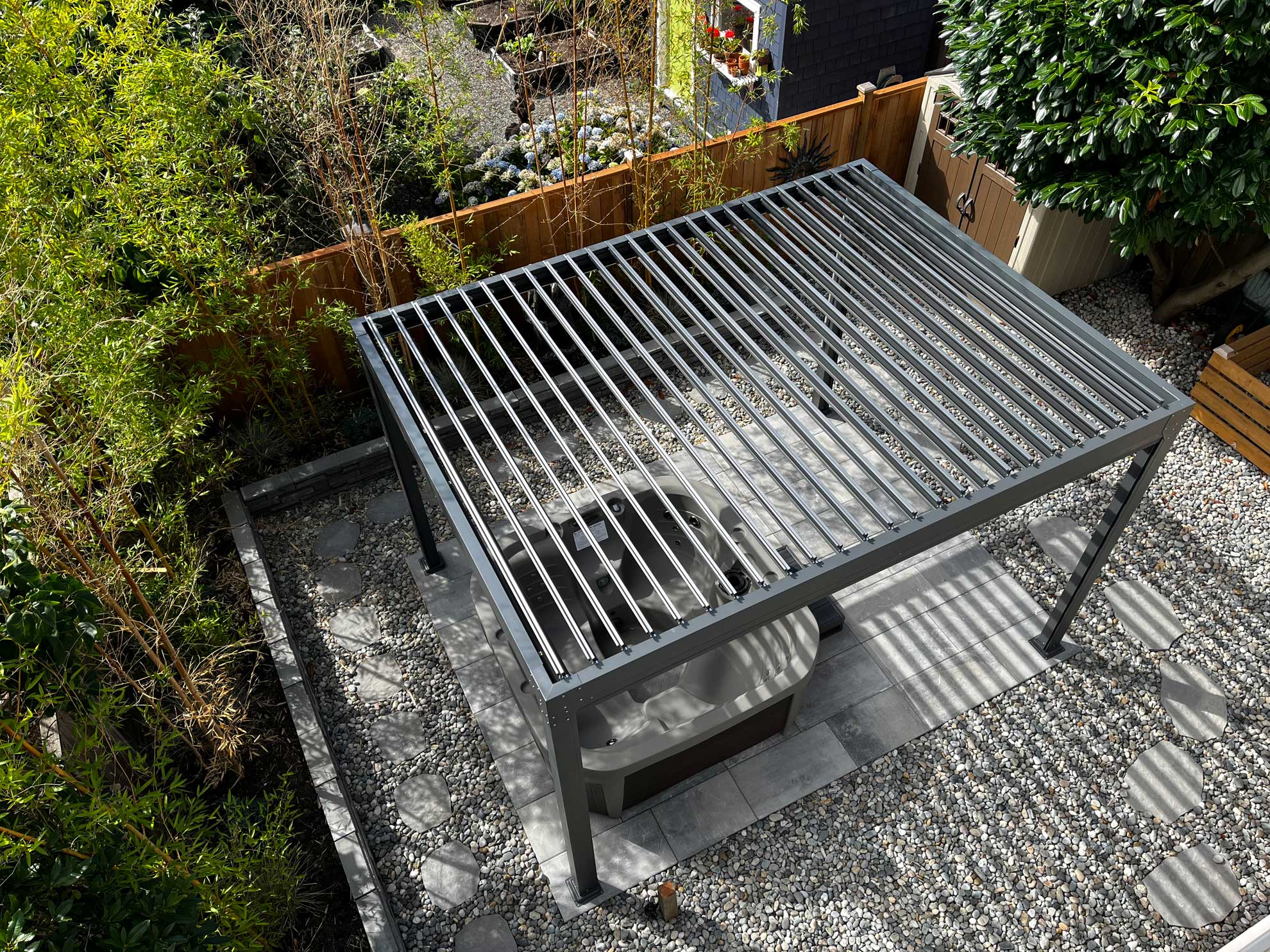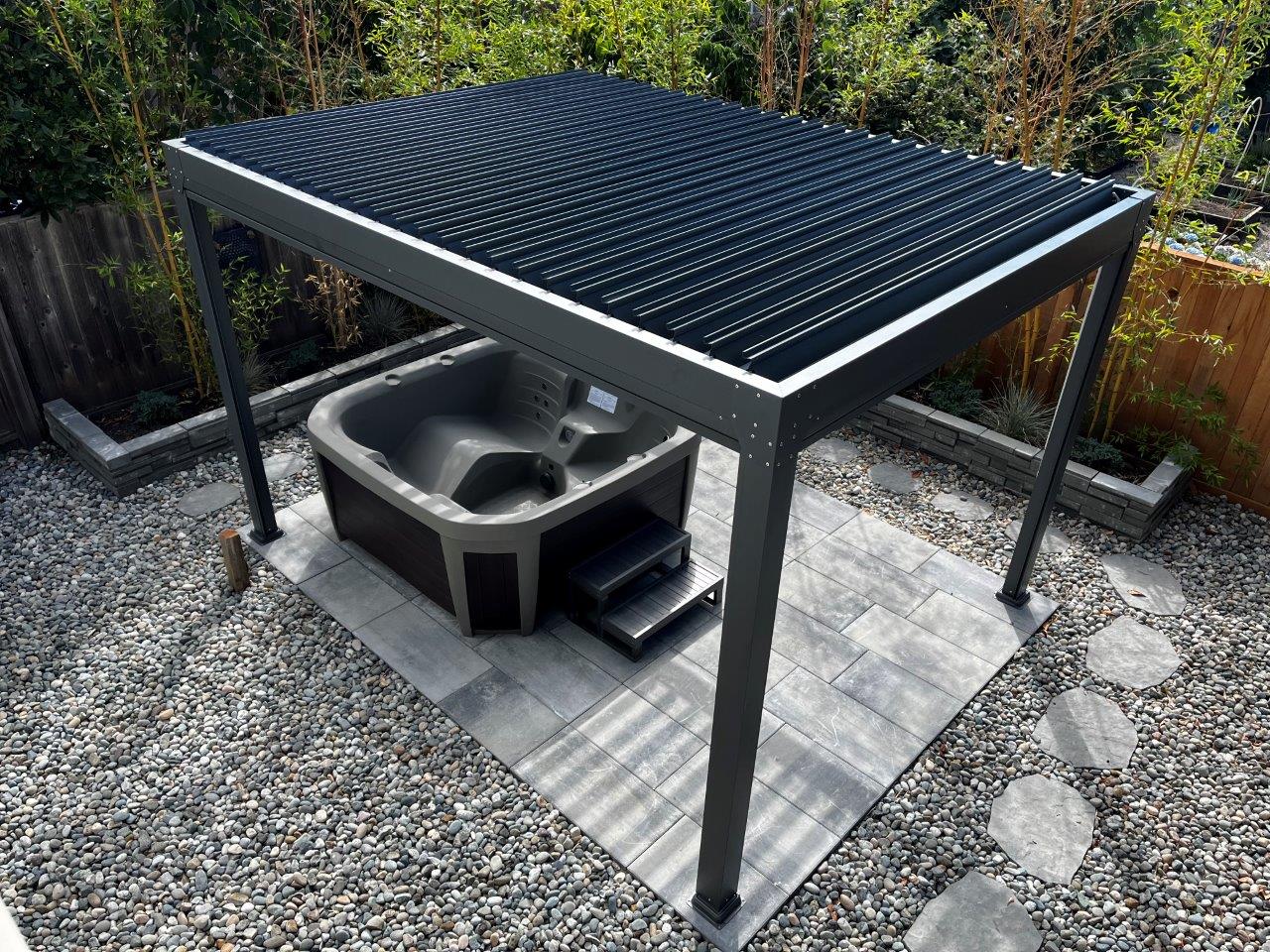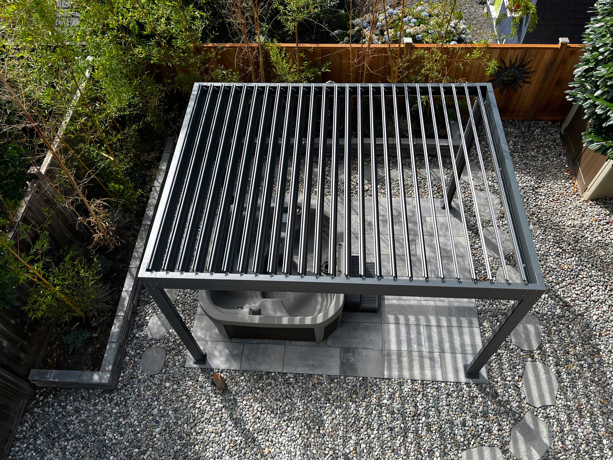 A designer inspired pergola that can come in several variations. Hand cranked louvers to block out the sun or shield you from the rain. Our screens use sliding channels which are built into the legs, creating a continuous block out for privacy or sunlight.