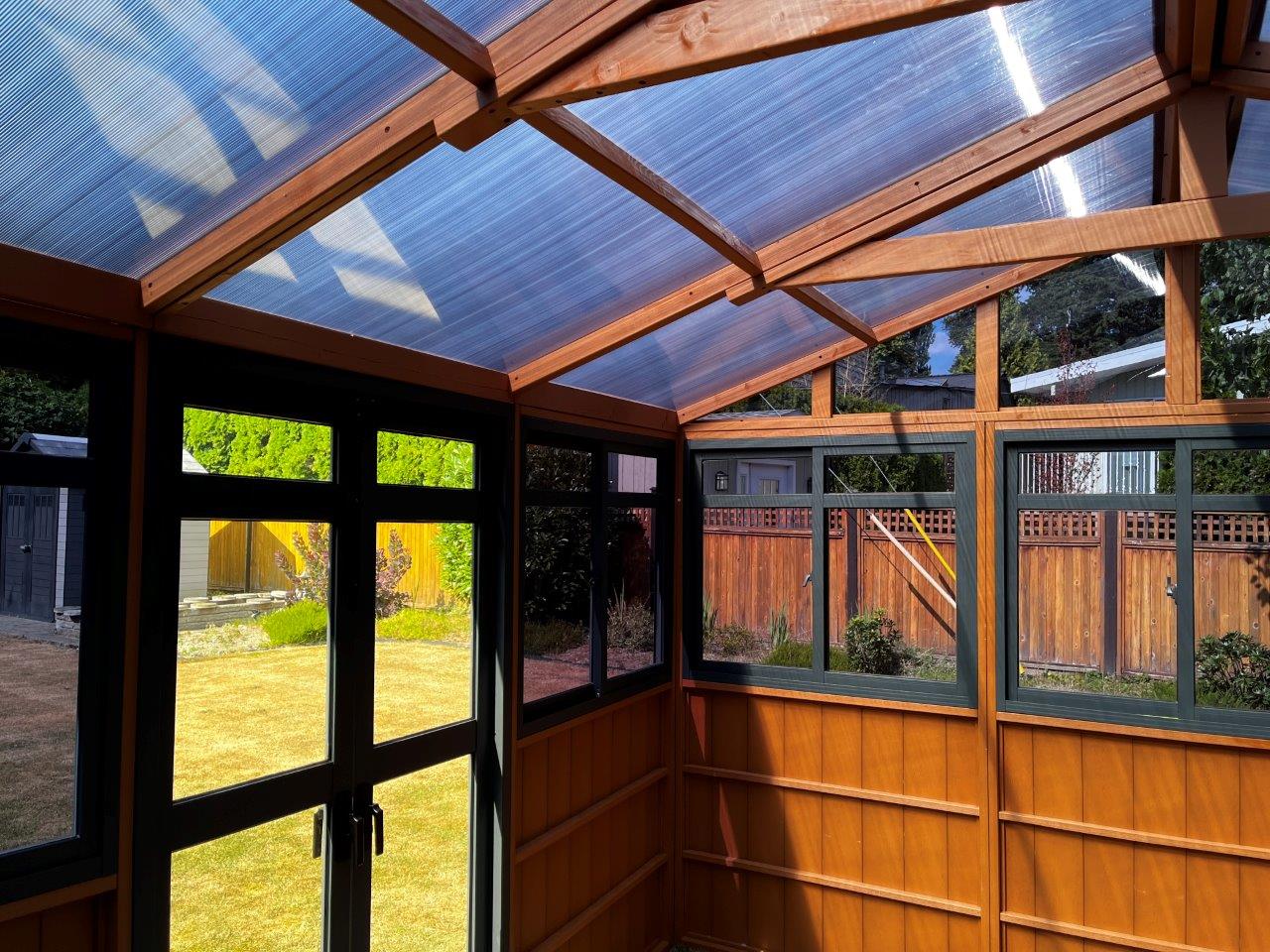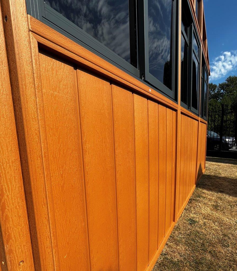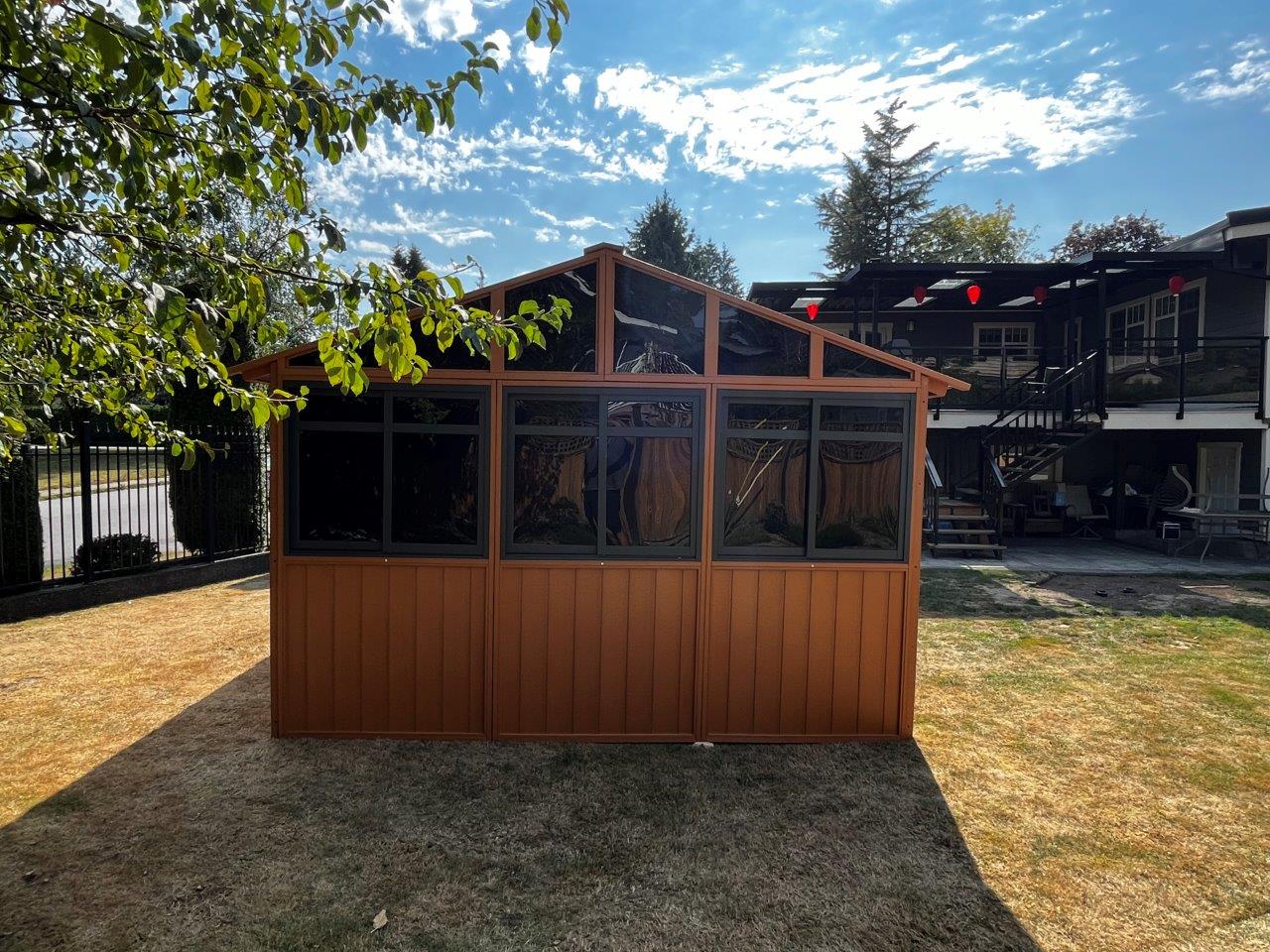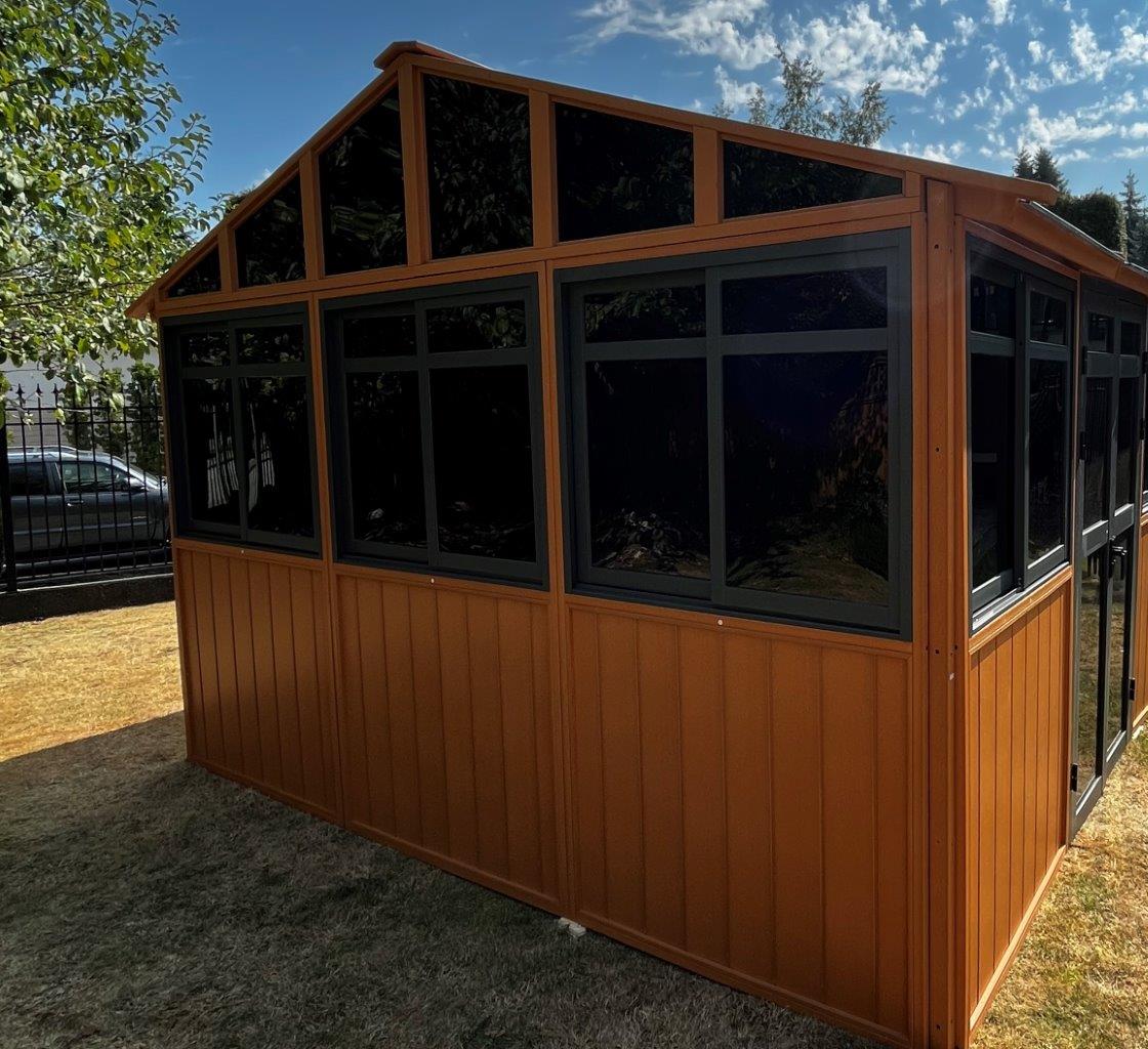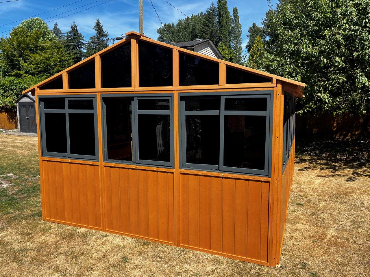 The Whistler 13×8 is a modern outdoor building with translucent Lexan roof panels that lets in a lot of natural light. Lexan is an excellent roofing material as it is super durable and virtually unbreakable. The Whistler can be used as a sunroom, spa gazebo, or backyard recreational studio. The wall panels are made of Durawood which looks like wood but is made of a high-quality synthetic material that is maintenance free and environmentally friendly. The Whistler has aluminum framed doors and windows to ensure smooth opening and closing. Optional sliding windows are available for the Whistler Collection.