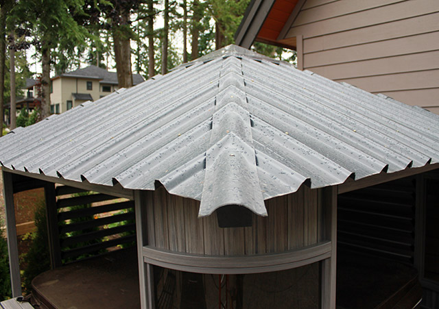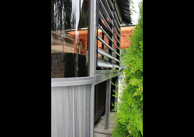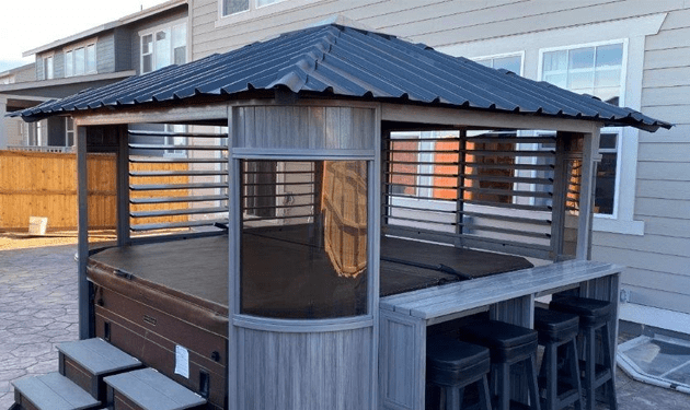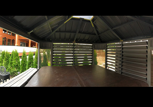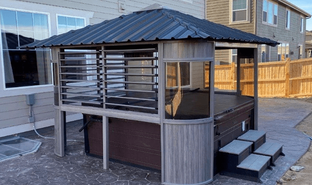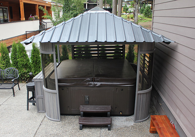 The Zento Coastal Gray is a synthetic wood gazebo designed to protect you and your spa from the elements while maintaining an open feeling. The gazebo includes two louver side windows for added privacy and a skylight to view the stars at night.